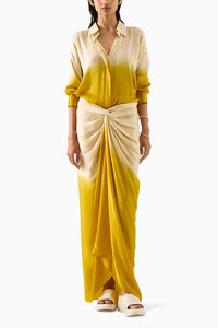 The Dawn Shirt Draped dress crafted from our stunning Vegan Silk fabrication, trans-seasonal, is a statement piece. The piece, made in our hand dyed cupro, is a one single dress. With tie ups at the waist, this dress in ivory and mustard has a relaxed shirt on top and attached skirt at the bottom. Featuring a draped skirt, this piece can be tied with a knot and can be styled in different ways. Wear it with heels for an elegant look.ÂÂ