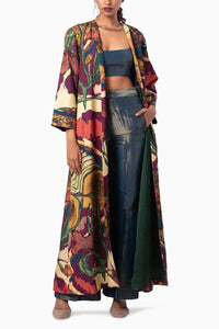 A structured trench with accents of hand embroidery all over and a contrasting deep green linen satin lining.