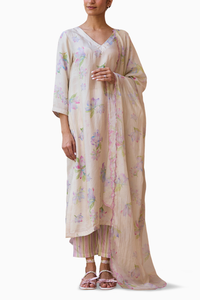 Featuring Dawn Magnolia Beige Kurta Set is crafted in luxurious handwoven mulberry silk in an ivory hue. The kurta itself is adorned with a stunning poppy hand-painted floral print, each delicate bloom adding a touch of natural beauty and femininity to the ensemble. Complementing the kurta is a pair of pants featuring a hand-painted striped pattern, adding a contemporary twist to this silhouette.