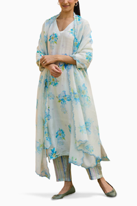 Featuring Dawn Poppy Ivory Kurta Set is crafted in luxurious handwoven mulberry silk in an ivory hue. The kurta itself is adorned with a stunning poppy hand-painted floral print, each delicate bloom adding a touch of natural beauty and femininity to the ensemble. Complementing the kurta is a pair of pants featuring a hand-painted striped pattern, adding a contemporary twist to this silhouette.