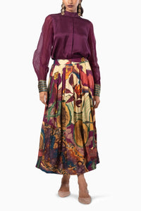 A high neck aubergine coloured shirt with volumiNous organza sleeves and hand embroidered cuff paired with a structured, box pleated skirt.