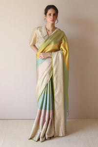 Handwoven in lustrous mulberry silk satin, its multicoloured stripes ripple like time across the body—fluid, radiant, and effortlessly modern.