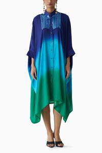 The Dead Sea Kimono crafted from our stunning Vegan silk fabrication, trans-seasonal, is a statement piece. Made in our Signature Ombrè style, this piece is Free Size & has a relaxed fit. Featuring a centre button opening, the dress has hand embroidered sequinned yoke and can be styled in different ways. Wear it with heels for an elegant look.