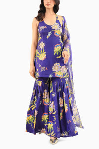 A vibrant Indian designer outfit featuring AmroodIndia’s exclusive floral print on fluid deep blue royal silk. The set includes a halter-style kurta with delicate back tie-ups, paired with a voluminous gathered sharara and a sheer organza dupatta that adds an airy elegance to the look. A contemporary silhouette rooted in tradition — perfect as festive wear for Haldi, Mehendi, Diwali soirées, intimate weddings, or destination celebrations.