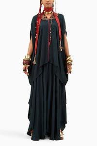 Featuring the Deep Teal Fizaa Kaftan Tunic Set, a stunning ensemble crafted from natural crepe. The free-size tunic features intricate embroidered neck detailing and is paired with anti-fit flared trousers, both adorned with exquisite beadwork and intricate machine embroidery. Elevate your style with this perfect blend of comfort and elegance.