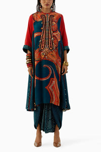 Experience enchantment with the Deep Teal Indra Choga Set. The easy-fit printed rudra kurta in natural crepe features front embroidery, paired harmoniously with printed drape trousers for a Relaxed Fit. Resham Thread Embroidery adds finesse. Elevate your style in captivating Deep Teal.