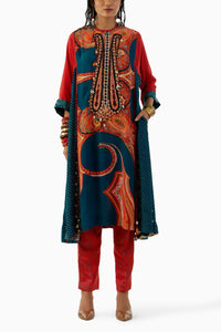 Indulge in the Deep Teal Indra Choga Set with Straight Trousers. The easy-fit printed rudra kurta in natural crepe features front embroidery, paired seamlessly with printed straight trousers in satin linen for a Relaxed Fit. Resham Thread Embroidery adds finesse to this captivating ensemble.
