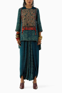 Elevate your style with the Deep Teal Mitra Short Kurta Set. The easy-fit printed mitra short kurta in natural crepe features front embroidery and tribal tassel detailing, paired seamlessly with printed drape trousers for a Relaxed Fit. Resham Thread Embroidery adds a touch of finesse.