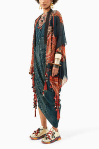Elevate your fashion game with Deep Teal Rasa One Shoulder Dress and Sheer Silk Jacket. The dress, crafted from natural crepe, features a captivating texture print, embroidery patch, tribal tassel detailing, and intricate bead and dori work. It's all about comfort and style. The set includes a free-size sheer silk jacket to complete your look.