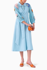 Introducing the Delfine Marine Suiting Dress, a sophisticated piece that beautifully combines elegance and comfort. This fit-and-flare dress features stunning embroidered sleeves and a layered nylon and cotton dobby fabric, highlighted by hand-embroidered sunflower appliqués. With convenient side pockets, chic white piping details, and a tie knot drape on the yoke, this dress is perfect for making a stylish statement at any occasion. Embrace effortless charm with the Delfine dress!