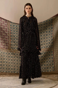 The most dreamy maxi, the Delilah Dress is designed with ethereal flared sleeves and romantic ruffles that flow with every step. Featuring a flattering V-neckline with delicate ties that can be worn open or fastened, it comes with a matching fabric belt to define the waist and balance its oversized, statement silhouette. Crafted in viscose georgette with shimmering gold jacquard dots, this fully lined piece exudes effortless glamour. Perfect for evening soirées, it’s a flowy masterpiece that commands attention.