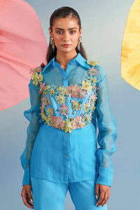 Composition- Pure Silk Organza and Stretch Satin Inner Color- Poppy Blue Details- Multicolor 3D Floral Work Components- 3 Product Code- SVEPARUSS25SHRT031