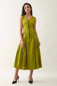 Featuring a sharp V-neck and sleek front zipper, the Della Leaf-Colored Sleeveless Dress combines modern style with functionality. Black zipper pockets add utility, while pleated and paneled hips create a flattering, structured silhouette, making it a versatile choice for both casual and dressier occasions.