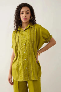 Featuring distinctive caterpillar detailing and precise topstitching, the Demur Offwhite Shirt blends whimsy with polish. Short puff sleeves with elastic cuffs add playful volume, while a white button front offers a crisp finish. This versatile shirt combines modern style with thoughtful details for casual or dressed-up looks.