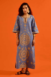 Featuring a denim blue cotton maxi dress with natural wave thread embroidery, this relaxed-fit design is crafted from denim, offering a perfect blend of casual cool and intricate detailing.