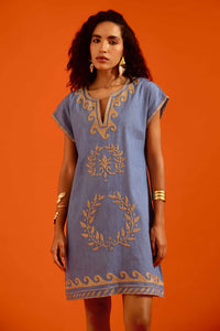 Featuring a blue cotton shift dress with natural wave thread embroidery, this relaxed-fit design is crafted from soft denim, blending everyday ease with organic-inspired detailing for a casually refined look.