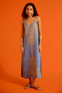Featuring a denim blue strappy dress with natural flame thread embroidery, this relaxed-fit piece is crafted from denim, offering a cool, casual vibe with unique embroidered detail.