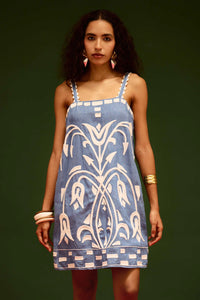 Featuring a denim blue strappy cotton shift dress with ivory garden thread embroidery, this relaxed-fit design is crafted from soft denim, offering a charming blend of casual style and intricate detailing.