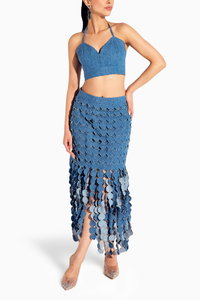 Featuring denim midi skirt with double laser layer and half denim lining, paired it with denim top with tie on halter neck and back opening.