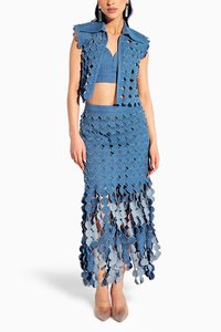 Featuring denim midi skirt with double laser layer and half denim lining, paired it with denim top with tie on halter neck and back opening and sleeveless laser cut denim jacket with collars and shoulder pads.