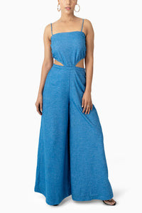 Featuring Denim Cuba Jumpsuit by Kiran Gupta Label. Embrace your style with this playful Denim jumpsuit accentuated with cut-out detailing, a strappy back, and a splash of neon on the back.