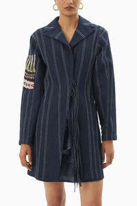 Featuring Denim blazer with contrast stitch lines and embroidery details on sleeves.