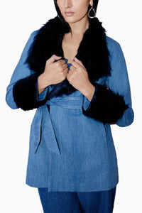 Featuring Denim jacket with fur lapels and cuffs with a tie around Belt