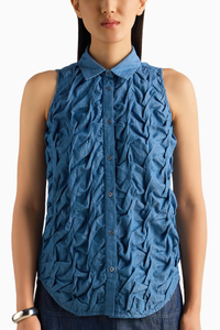 Featuring the Denim Hand Tuck Shirt by MellowDrama's by Utopia Collection. Made from lightweight slub denim in 100% cotton, this sleeveless shirt showcases hand tuck detailing at the front. It features a front opening with buttons, a curved bottom hem, and offers a regular fit for a stylish and comfortable look.