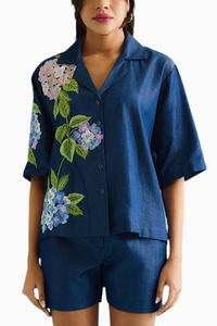 A charming blend of casual denim and delicate embroidery. Crafted from premium denim fabric, this shirt features intricate hydrangea embroidery on the front, adding a touch of femininity. The half-sleeve design offers a relaxed and casual vibe, perfect for everyday wear or casual outings. Pair it with shorts for flattering fit and a timeless silhouette, making them perfect for various occasions. With their durable construction and effortless style, this set is sure to become your go-to choice for everyday wear.
