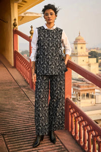 Sleeveless overlay popover in a denim abstract patterned jacquard. Round neck with tie knot closure on the sides. Paired with matching straight-cut denim abstract patterned jacquard pants with a semi-elasticated waist. Pockets in the front and back. Belt loops, and a front zipper and hook closure.