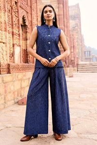 A band collar waistcoat-inspired top in soft knitted indigo denim lace fabric with a floral jacquard weave. Sleeveless and relaxed fit, it features dramatic matte silver buttons down the front. Paired with matching high-waisted pants with a flared hem, inverted sewn-down pleats at the waist create a flattering shape. The pants are elasticated at the waist with a hook/eye and zip closure at the side. Both pieces are fully lined for comfort and a polished finish.