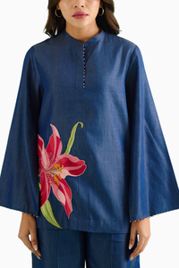 A captivating blend of casual charm and intricate detailing. Crafted from premium light weight denim fabric, this shirt features delicate lily embroidery, adding a touch of elegance and femininity. The cape design lends an effortless yet sophisticated flair, perfect for adding a statement to your ensemble. Pair it with jeans for a stylish denim-on-denim look or with trousers for a chic contrast.