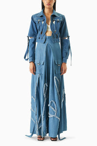 Step into style with our Denim Loop Jacket, paired perfectly with a stunning cobalt denim floral appliqué skirt. This dynamic duo combines the edgy appeal of the loop jacket with the vibrant, intricate floral detailing of the skirt. Crafted from high-quality denim, the jacket offers a modern silhouette, while the skirt adds a playful touch. Ideal for any occasion, this ensemble promises to turn heads and keep you comfortable. Elevate your wardrobe with this fashionable combination!