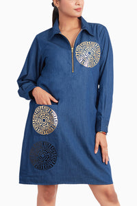 Introducing the Denim One Piece Dress with Pocket and Applique. Made from durable denim, this regular-fit dress features a classic design with a functional pocket and intricate applique details. The foil print adds a modern touch, making it a perfect blend of casual comfort and stylish flair for any occasion.