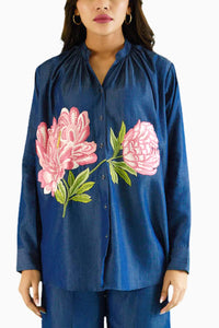A delightful combination of casual chic and feminine flair. Crafted from premium light weight denim fabric, this shirt features intricate peony embroidery, adding a touch of elegance and charm. The gathered detailing at the waist creates a flattering silhouette. The button-up front and classic collar offer a timeless appeal, perfect for both casual outings and semi-formal occasions. Pair it with jeans for a relaxed yet stylish look or with tailored trousers for a more polished ensemble.Â