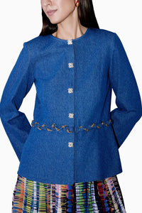 Featuring Denim jacket with denim and gold braid detailing with stone buttons