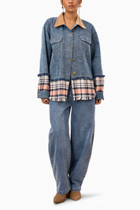 Relaxed fit denim shacket featuring a cozy corduroy collar and contrast plaid panels at sleeves and hem.