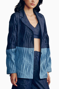 Perfectly oversized, this blazer is cut from two tones of denim wash which are then neatly pleated for a unique texture play.