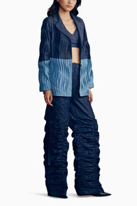 Perfectly-pieced-together from our washed denim fabrics this set stands out for its dual denim pleated blazer and gathered flared pants. Tailored for style and comfort.
