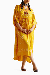 Mustard Yellow Kaftan in handcrafted bandhini , with mirror work and coins and chain hand embroidered v neckline to create a stunning look!