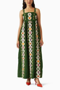 a gorgeously fun ma xi dress cra fted in a deep forest green summer linen. The Devon is a dress with cha rms &a mp; motifs embroidered on linen ba dges - which a re then embroidered onto the dress !! The smocking a t the ba ck provides a fla ttering fit while the hidden pockets a dd pra ctica lity to the elega nt , flowy silhouette. a Midsummer Night’s drea m !!