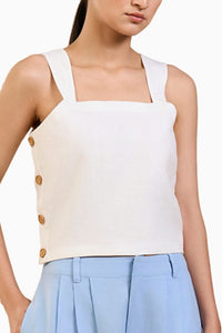 Dewdrop Camisole; a delicate wide shoulder straps and a square neckline create a refined yet understated silhouette. Accentuated with wooden buttons along the side seam, it's designed for both style and ease, featuring side closures and subtle slits for effortless movement and a hint of allure.