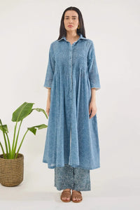 As soft as a drizzle on a quiet morning, this dress is crafted from airy cotton mul-ml, allowing for effortless movement. The gentle pintucks on the bodice mimic ripples in a rain-kissed lake, while the button down fluid silhouette mirrors the rhythm of falling raindrops. This resist print dress features a peter pan collar with highlight of white tape and quarter length raglan sleeves with subtle tonal stitching adds an artisanal touch, making it a timeless ode to nature, quiet beauty.