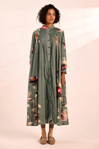 A flowing button-down dress in airy voile, adorned with a painterly floral print. Delicate pintucks frame the bodice, while full sleeves and a relaxed silhouette offer ease and movement. A timeless piece with quiet elegance, fully lined for comfort.