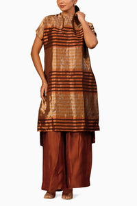 Embrace elegance with our two-piece set, featuring a high slit cowl neck kurta with drop sleeves, and broad pants. The kurta comes with a comfortable cotton shantoon lining and a high-low design for a modern silhouette. Paired pants exhibit front pleating and a stretchable back waistband, ensuring both style and comfort. Perfect for adding a contemporary touch to traditional elegance.