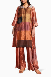 Step into elegance with this two-piece set, featuring a knee-length collared kurta that offers a polished look with a straight cut. The kurta boasts wide 3/4 sleeves with a slit at the opening for a touch of modern flair. Paired with these are our A-line silk pants, detailed with box pleats and an elastic back, ensuring both style and comfort.