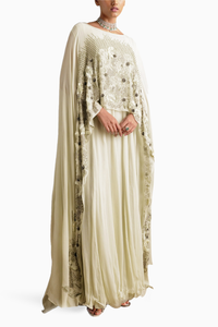Step into elegance with the Diacia Kaftan Dress by NSS's The Bloom Collection. Crafted from Chiffon & Crepe in a refreshing Mint hue, this floral kaftan dress is heavily hand-embroidered with fine bugle beads, rhinestones, sequins, and highlighted with laser-cut petals hand appliqué work, creating a truly exquisite and enchanting ensemble.