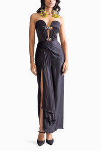 Featuring Diamond Black Dress by Saaksha & Kinni from Botanica Collection. Strapless gown accentuating a pleated, side-slit drape with keyhole detailing. Adorned with intricate mirror and thread hand-embroidered panels, this gown combines elegance and artistry for a stunning, sophisticated look.