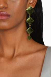 The diamond danglers in a dusty gold suede and a bold green foil have a different look yet both are extremely versatile and lightweight. The pieces are asymmetrical with diamond pieces going from ascending and descending order in both ears. While the gold can be played around with almost anything you own, we suggest dressing the green up with your best dress and let the pieces create all the charm!