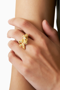 The product is finished in Gold Polish. Avoid contact with water & perfume. Can show signs of tarnish over time with exposure to moisture/sweat.